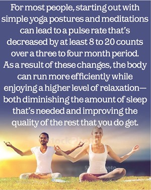 For most people, starting out with simple yoga postures and meditations can lead to a pulse rate that’s decreased by at least 8 to 20 counts over a three to four month period. As a result of these changes, the body can run more efficiently while enjoying a higher level of relaxation—both diminishing the amount of sleep that’s needed and improving the quality of the rest that you do get.